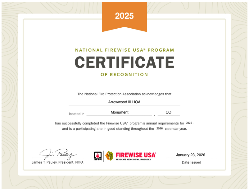 We are a Firewise Community and take actions as a community to mitigate fires. Here’s the latest full Community Firewise Assessment that was completed for Arrowwood III and our latest program certificate. To maintain our program status every year as a community we host Chipping Days and provide opportunities for community members to be trained.